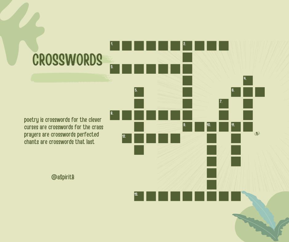 crosswords Leave a Comment / Feature Poetry, Jesus Christ, Poetry, Proverb / By Spirit B / October 20, 2025 poetry is crosswords for the clevercurses are crosswords for the crassprayers are crosswords perfectedchants are crosswords that last spirit b Like this:Like Loading... Related Posts the wise and foolish Proverb / May 14, 2025 inner tuition Proverb / May 14, 2025 more of it Proverb / May 14, 2025 quest in the question LOGOS, Proverb / May 14, 2025